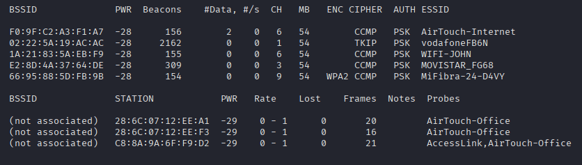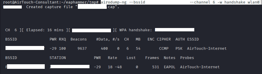 Command: airodump-ng –bssid F0:XX:XX:XX:XX:XX –channel 6 -w handshake wlan0