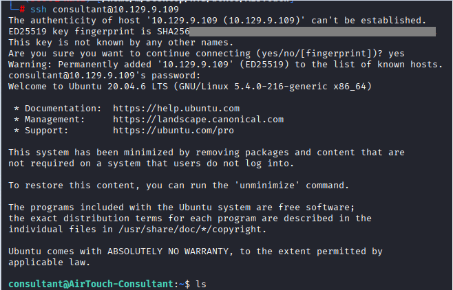Command: ssh consultant@10.129.9.109, Password as given “RxBlZhLmOkacNWScmZ6D”