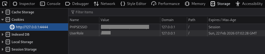 Now right click anywhere on the page and click on inspect, go to “cookies” and set the above PHPSESSID and UserRole fetched from the http packet