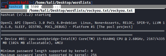 Command: hashcat -m 5500 rXCXSl::::4eXXXXXXXXXXXXXXXXXXXXXXXXXXXXXXXXXXXXXXXXXXXXXXXXXXXXX52f74 /usr/share/wordlists/rockyou.txt/rockyou.txt