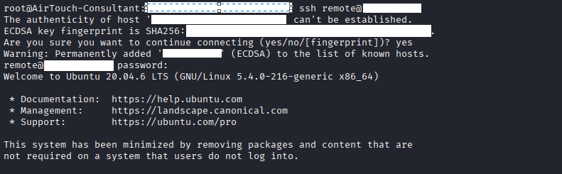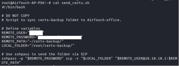 Command: ssh remote@10.10.10.1, and enter the password from send_certs.sh