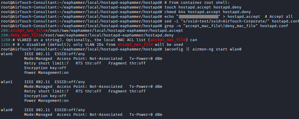root@AirTouch-Consultant:~/eaphammer/XX/XX/## echo “XX:XX:XX:XX:XX:XX” > hostapd.accept # Accept all