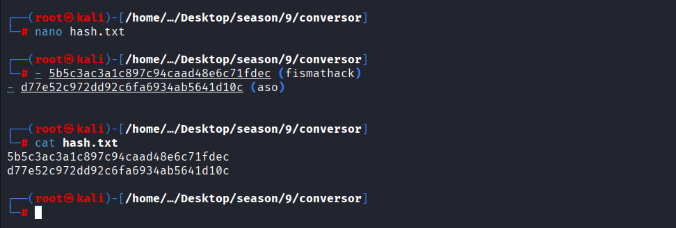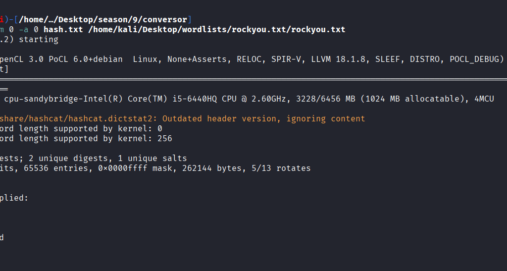 Command: hashcat -m 0 -a 0 hash.txt /home/kali/Desktop/wordlists/rockyou.txt/rockyou.txt