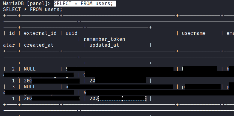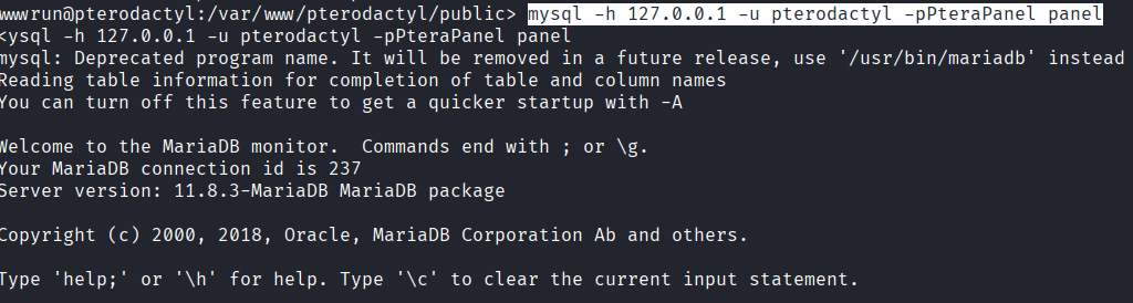 Command: mysql -h 127.0.0.1 -u pterodactyl -pPteraPanel panel