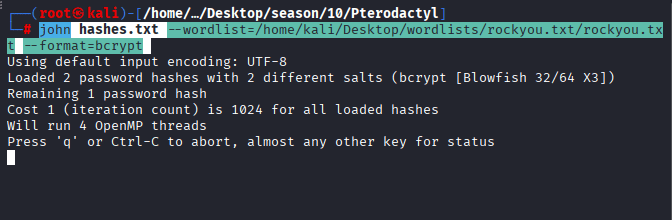 Command: john hashes.txt –wordlist=/home/kali/Desktop/wordlists/rockyou.txt/rockyou.txt –format=bcrypt