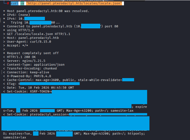 Command: curl -v “http://panel.pterodactyl.htb/locales/locale.json”