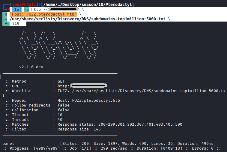 Command: ffuf -u http://10.129.5.199/ \ -H “Host: FUZZ.pterodactyl.htb” \ -w /usr/share/seclists/Discovery/DNS/subdomains-top1million-5000.txt \ -fs 145