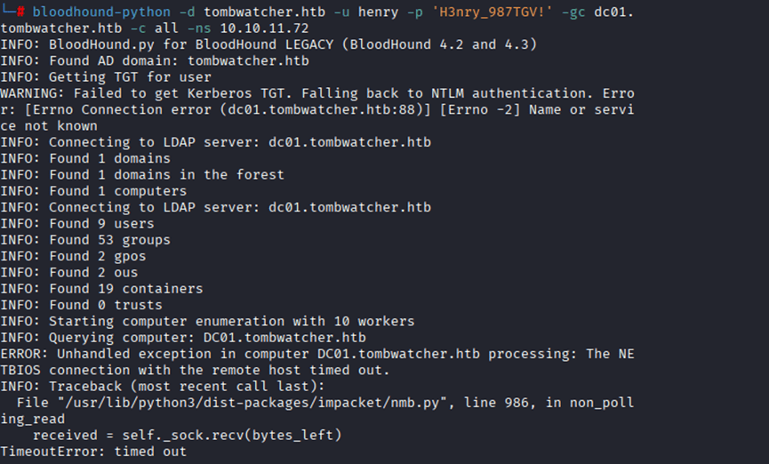 Command: bloodhound-python -d tombwatcher.htb -u henry -p ‘H3nry_987TGV!’ -gc dc01.tombwatcher.htb -c all -ns 10.10.11.72