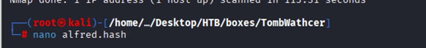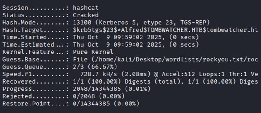Command: hashcat -m 13100 alfred.hash /home/kali/Desktop/wordlists/rockyou.txt –force