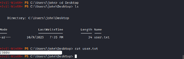 Command: evil-winrm -i tombwatcher.htb -u “john” -p ‘P@ssw4rd123’