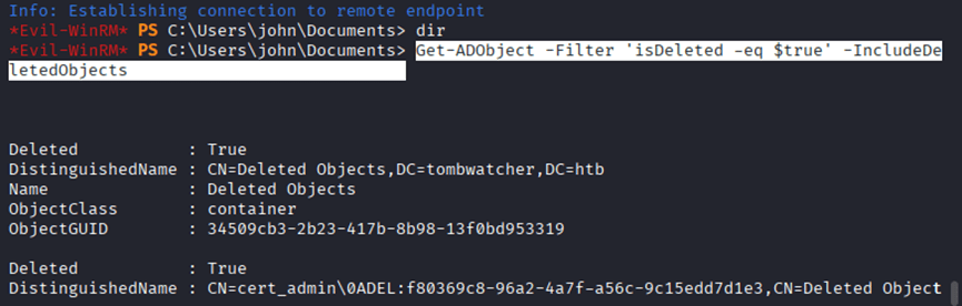 Command: C:\Users\john\Documents> Restore-ADObject -Identity 938182c3-bf0b-410a-9aaa-45c8e1a02ebf