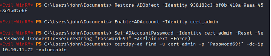 Command: Set-ADAccountPassword -Identity cert_admin -Reset -NewPassword (ConvertTo-SecureString “Password69!” -AsPlainText -Force)