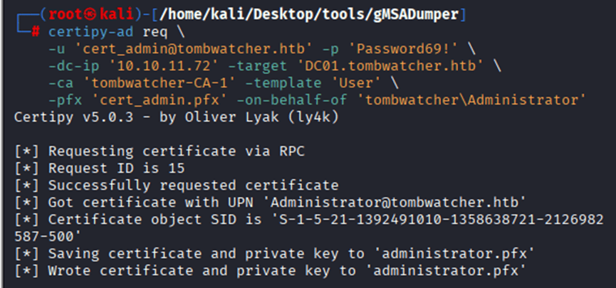 -pfx ‘cert_admin.pfx’ -on-behalf-of ‘tombwatcher\Administrator’